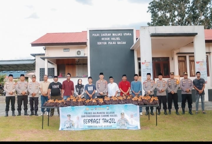 Rubrikmalut.com – Polres Kabupaten Halmahera Selatan, menggandeng Wartawan dan Komunitas Penulis (Warkop), serta Komunitas Jurnalis Halsel (KJH) menggelar kegiatan Ramadan 1447 Hijriah dengan membagikan takjil gratis kepada masyarakat. Kegiatan tersebut dipusatkan di depan Polsek Bacan, Desa Mandaong, Kecamatan Bacan Selatan, Jumat 6/3/2026.