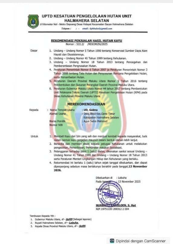 “Dari laporan masyarakat dan hasil temuan kami di lapangan, benar adanya rekomendasi bodong yang beredar di wilayah Gane. Dengan rekomendasi itu kemudian aktivitas penebangan dan penjualan kayu secara ilegal semakin marak,” ujar Ady kepada media ini, Sabtu 14/3/2026