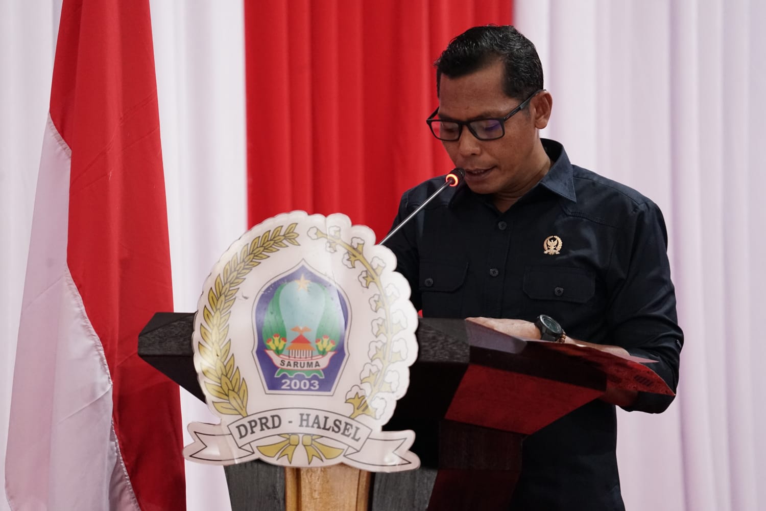 dalam penyampaian, Fraksi Golongan Karya (Golkar) ‘Rustam Ode Nuru‘ selaku ketua Fraksi membeberkan poin-poin Pemandangan terkait pidato Bupati Bassam Kasuba, yang di anggap masih jauh dari gambaran kondisi fiskal daerah secara jujur dan menyeluruh, narasi optimisme yang di bangun pemerintah, belum ditopang oleh strategi yang kuat, data yang akurat, serta evaluasi yang jujur terhadap realitas pembangunan di Halmahera Selatan. “Jelas Rustam.